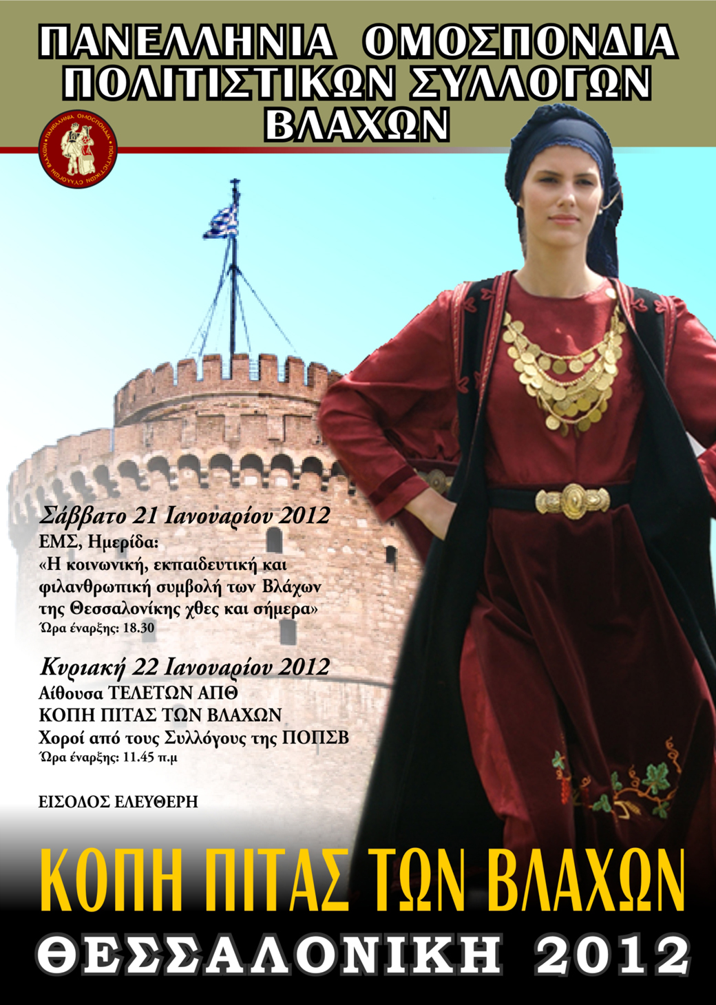 «Η κοινωνική, εκπαιδευτική και φιλανθρωπική συμβολή των Βλάχων της Θεσσαλονίκης χθες και σήμερα» και την Κυριακή στην "Αίθουσα Τελετών" του Αριστοτελείου Πανεπιστημίου Θεσσαλονίκης θα κοπεί η πίτα των Βλάχων.