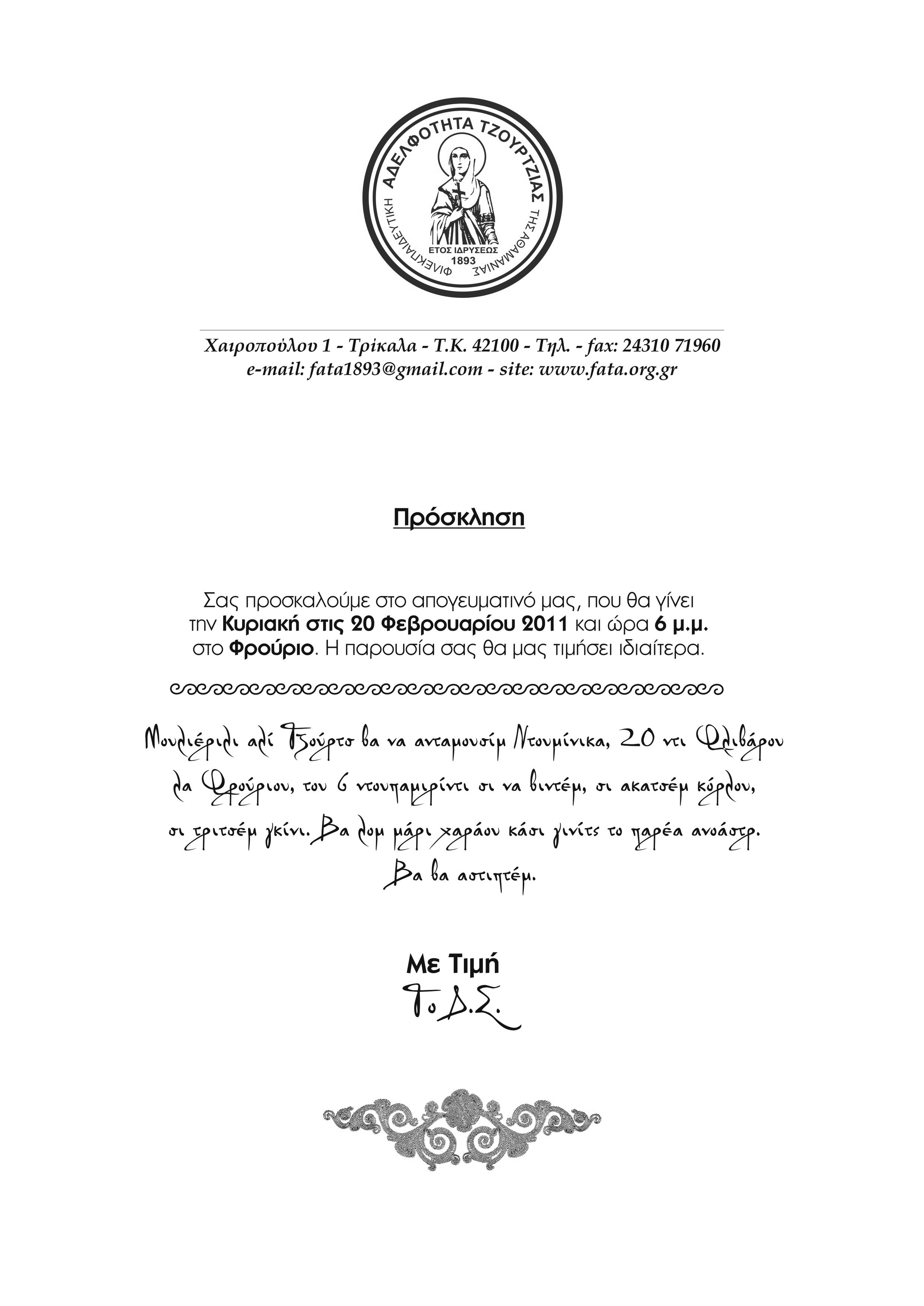 Επίσης, λάβαμε από τον έτερο Βαγγέλη Σαμαρά, τον Υπεύθυνο Εκδηλώσεων & χορευτικών τμημάτων της ΦΑΤΑ την πρόσκληση για το απογευματινό της Αδελφότητας που θα γίνει στις 20-2-2011 στο Φρούριο Τρικάλων. Η πρόσκληση ήταν μια ευχάριστη έκπληξη, όχι μόνο καλαίσθητη αλλά και πρωτοποριακή. Διαβάστε την και θα δείτε.