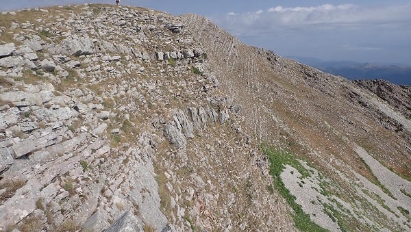 Φτάσαμε αβίαστα στο κολωνάκι στα 2.299μ και από κει πρότεινε ο Παντελής και κατεβήκαμε από τη Μεγάλη Χράπα. Δύσκολη κατάβαση, που δεν τη συστήνουμε, αλλά την κάναμε με πολύ χαρά, αφού αξιωθήκαμε να πατήσουμε σε μέρη που μέχρι και τη δεκαετία του 70 ήταν γεμάτα ζωή από τα κοπάδια. Περάσαμε πολύ κοντά από το Δέλτα του Καταραχιά, φτάσαμε στον Καλόγερο, μετά βρεθήκαμε στο Λα Ουρτζούκ (μέρος με τσουκνίδες) με τα σπάνια πετρώματα σαν απολιθώματα και τελειώνοντας την απότομη κατηφόρα φτάσαμε στις Κοπάνες του Τζουρτζιώτικου. Για πρώτη φορά είδαμε την απαρχή του ποταμού μας, εκεί που η γη γεννάει τα νερά που συναντούμε πιο κάτω, στον καταρράκτη της Τζούρτζιας. Στεγνές φέτος οι Κοπάνες, μακάρι να είναι μόνο ένα άνυδρο καλοκαίρι και όχι η κλιματική αλλαγή. Συνεχίσαμε στην τοποθεσία Λα Ντουμνιάσκα και μετά στην πηγή Χασάνι πάνω από την ποτίστρα. Περάσαμε και από το μαντρί Στουρνάρι με την τρύπα Λα γκούβα και βγήκαμε στη βρύση του Γκρέκου.